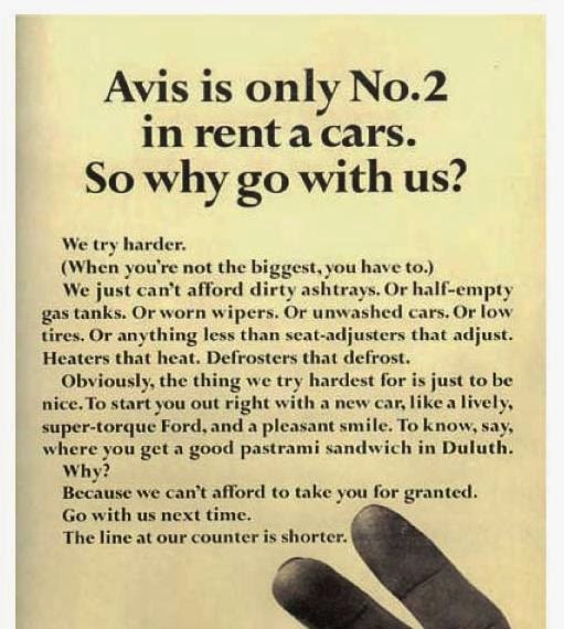 Avis ran a whole ad campaign for several years based on the fact that they were NOT the number one company in their industry.